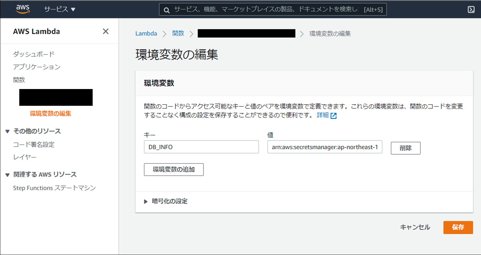 SecretsManager의 정보 자체는 Lambda의 환경변수로 아래와 같이 설정하면 된다.